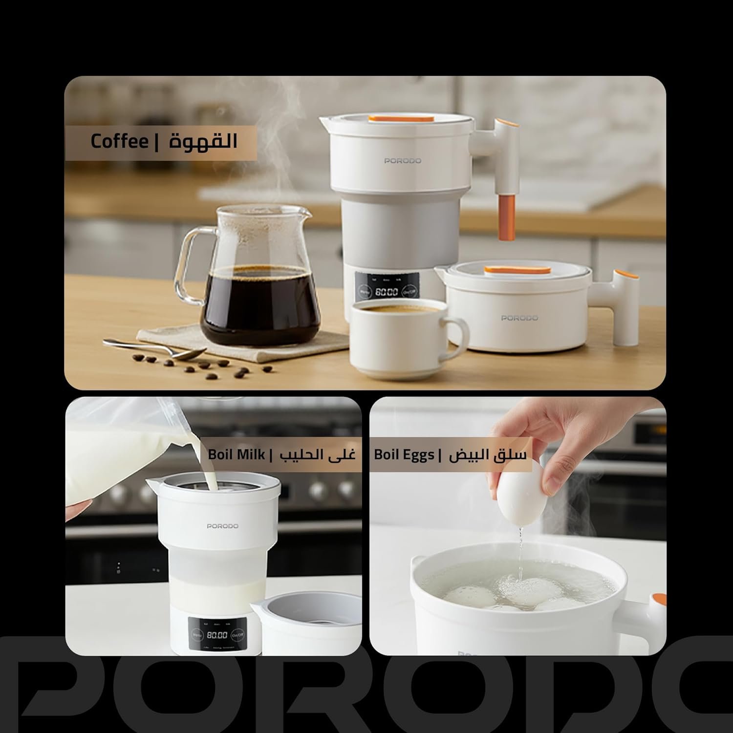 - Collapsible Design: Unique The Porodo electric kettle folding design makes it great to take on trips, vacation, camping holidays